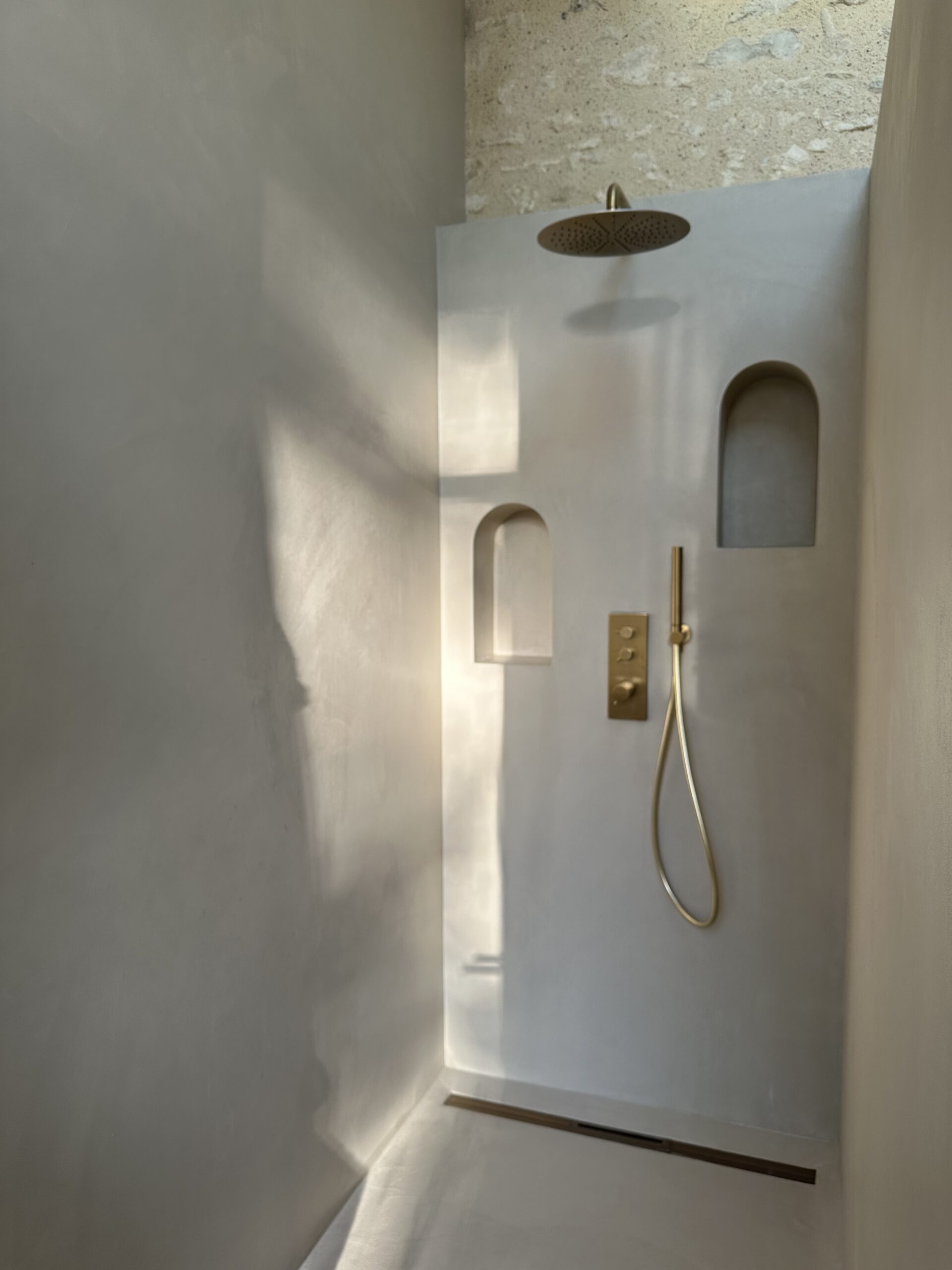 Une douche à l’italienne équipée de la robinetterie assortie Ondina Cristina en or brossé,