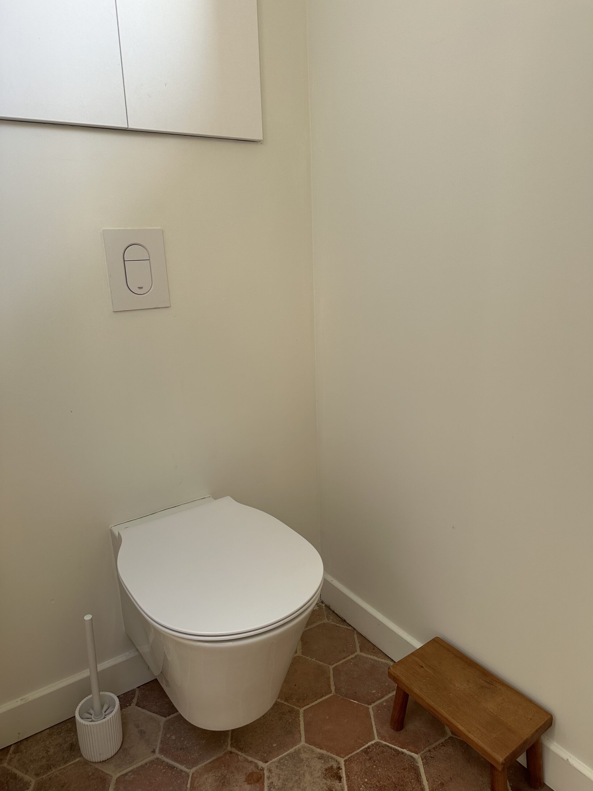 Rénovation intégrale desalle de bain pour notre client à Saint-Léonard-en-Beauce (41). Fourniture et pose des équipements sanitaires hauts de gamme pour la salle de bain et le wc attenant.